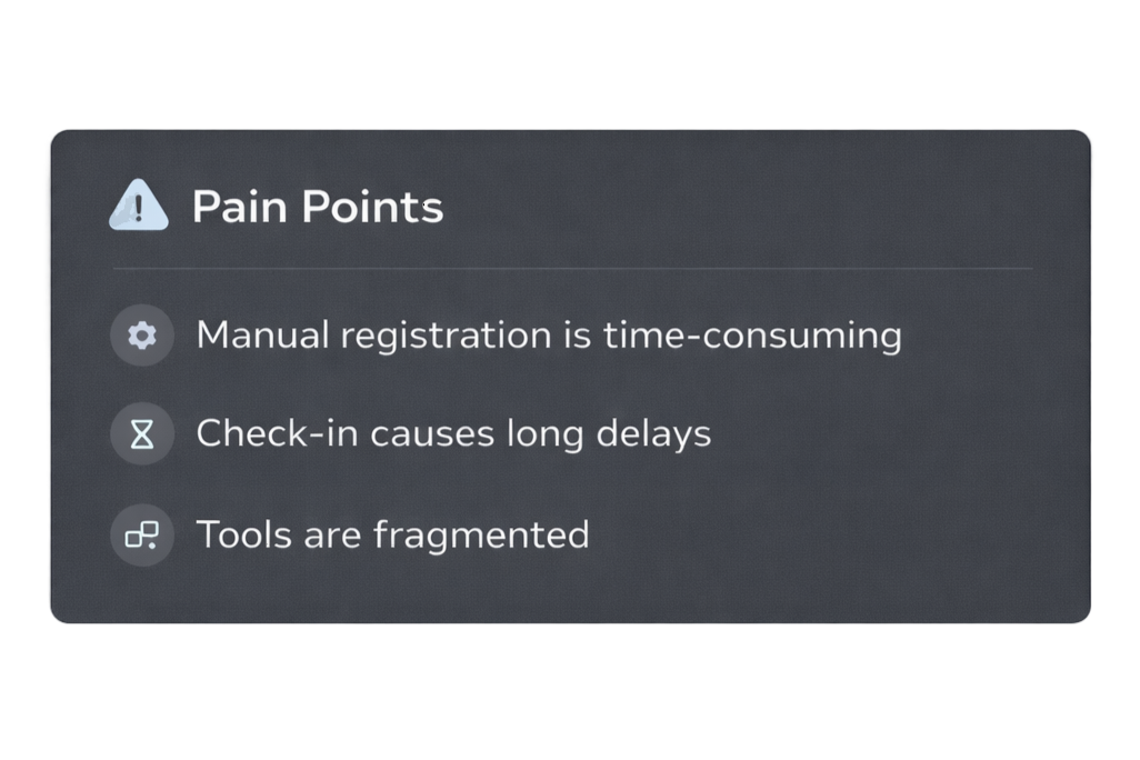Event planners rely on multiple tools to manage registration, attendance, and feedback. This fragmented workflow leads to inefficiencies, manual cross-referencing, and increased operational overhead.